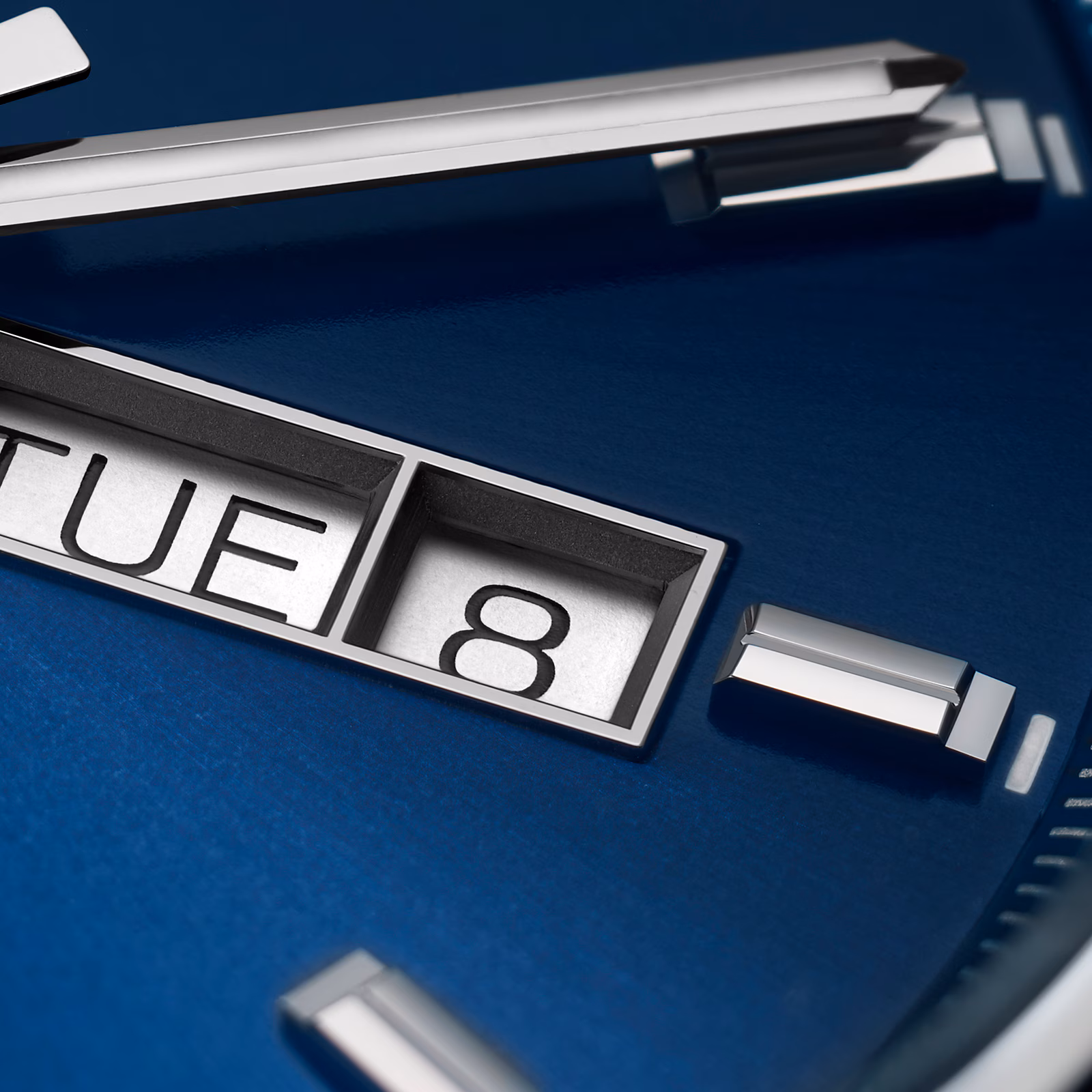 - Blue sunray dial with bold hands and indexes and a day-date display