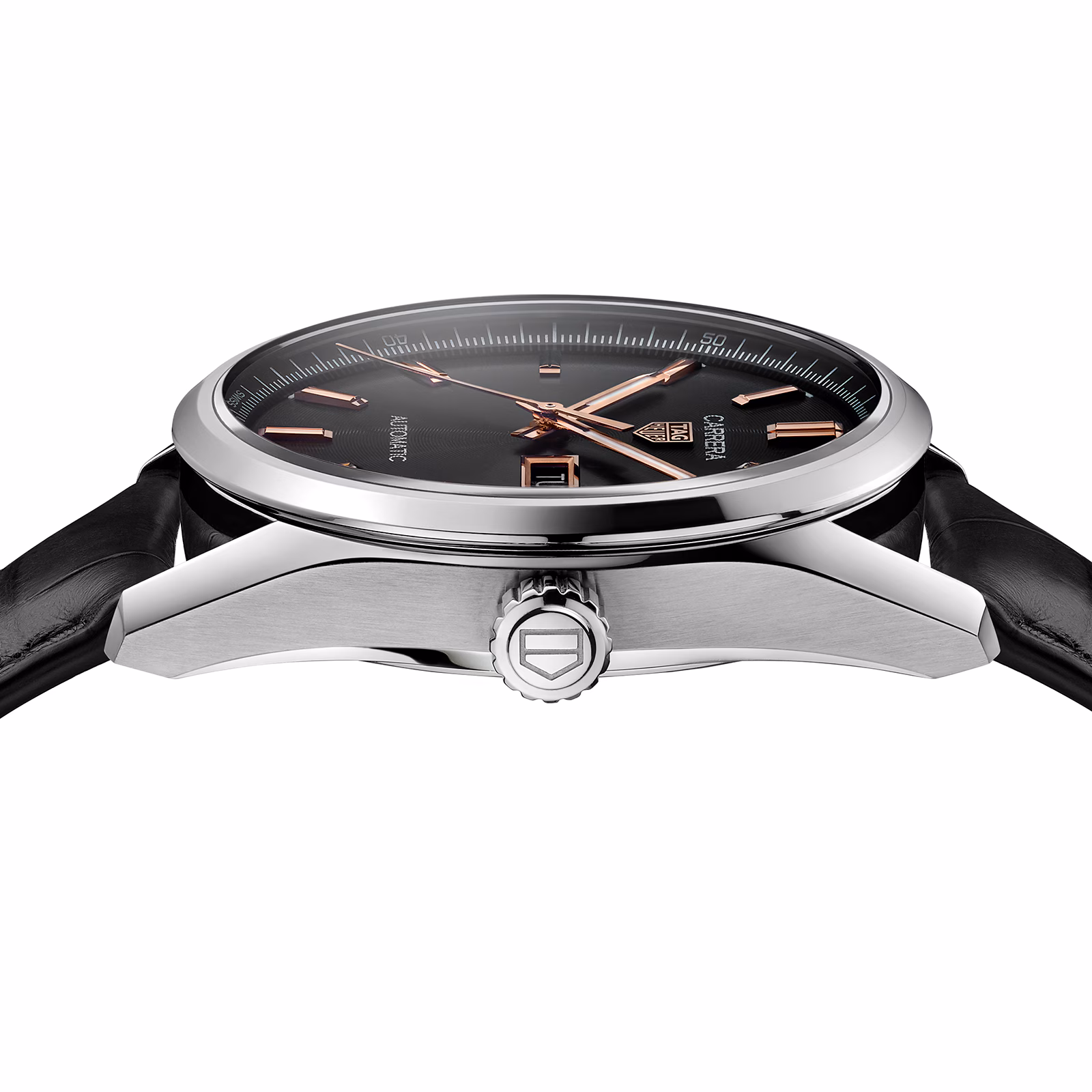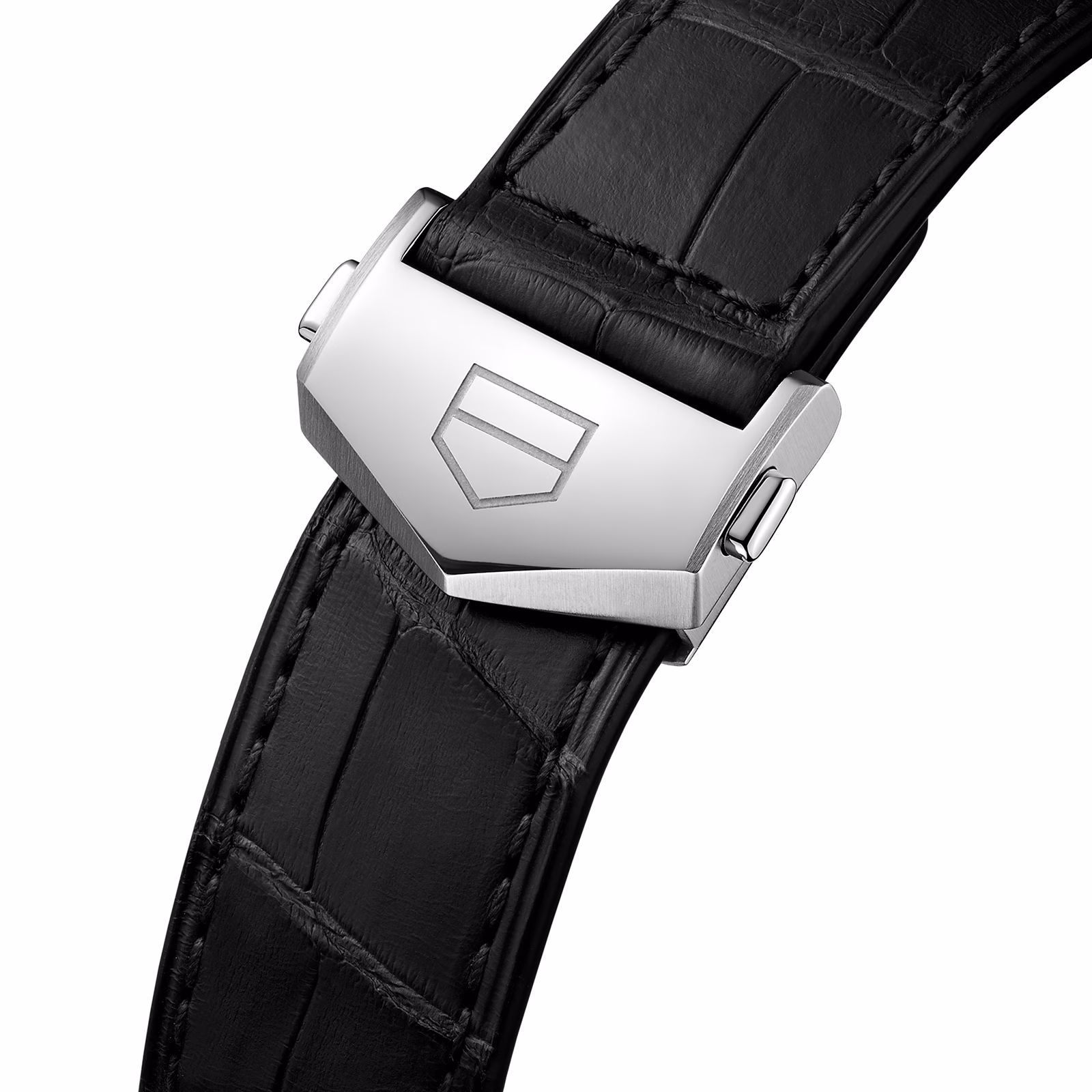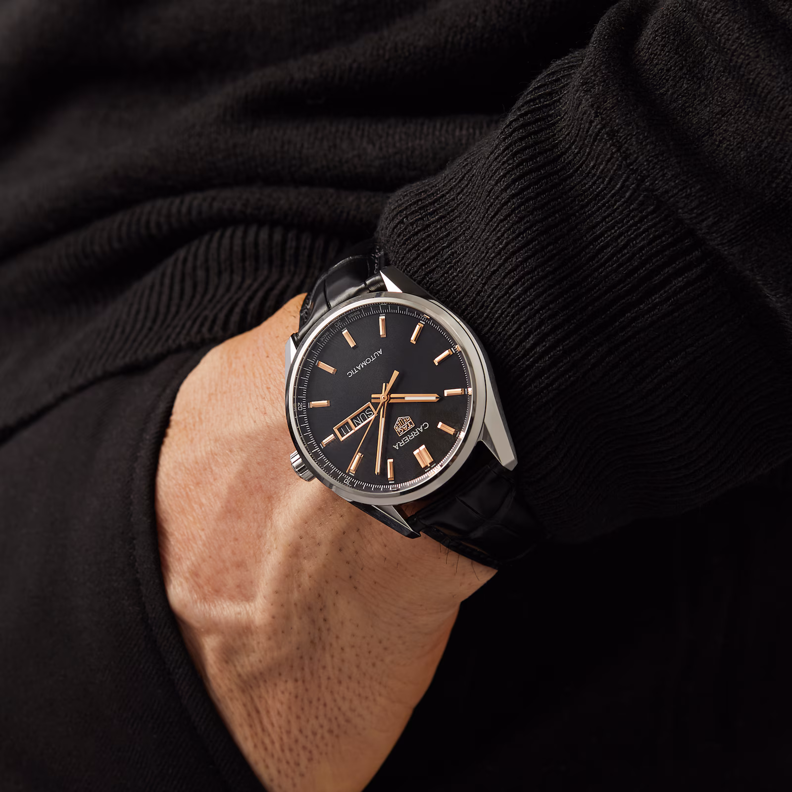 This Carrera 41mm model makes a strong impression, with distinctive looks and proud reliability. The bold lines of the steel case reflect strength of character, while the calibre 5 automatic movement delivers endless functionality, and the black and gold tones create a striking luxury aesthetic.