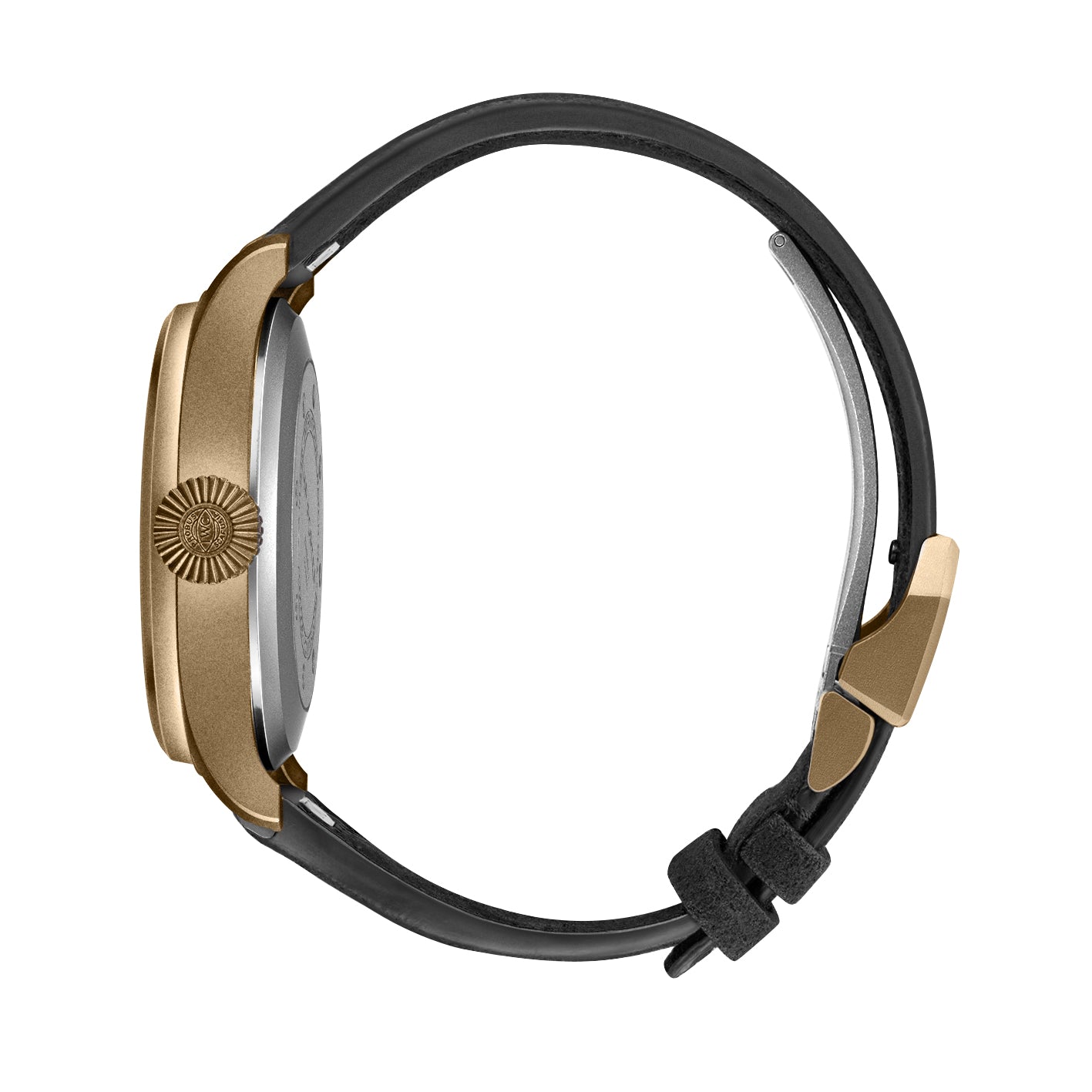 Highlights: The IWC Big Pilot’s Watch 43 “MR PORTER EDITION 1” (IW329703) is limited to 500 watches. It features a case and crown made of bronze. One of the first alloys to be produced by man, bronze is a durable and rugged metal that stands out for its golden-brown hue. Another striking feature is its ability to develop a patina over time, making each timepiece unique. The black dial, the gold-plated hands, and the subdued numerals harmonize perfectly with the bronze. At work inside the case is the IWC-manufactured 82100 caliber, a robust and reliable automatic movement. This mechanism uses the rotor’s smallest movements in either direction to build up a power reserve of 60 hours in the mainspring.