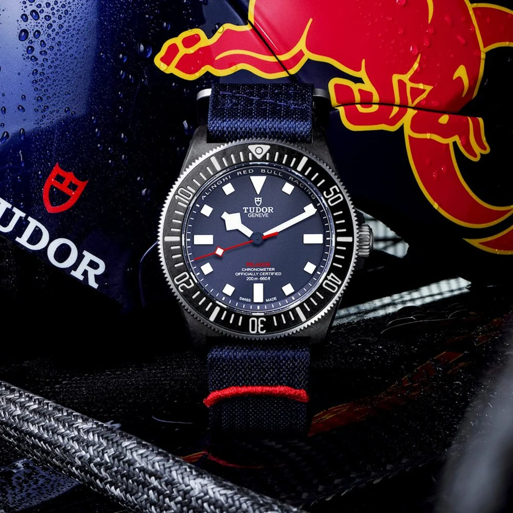 TUDOR Pelagos FXD x Alinghi Red Bull Racing Edition 42mm Men's Automatic Watch M25707KN-0001. Carbon composite 42mm case and bezel all on a blue fabric strap. This matte blue dial with luminous applied hands and hour markers, red seconds hand. Special caseback engraved with Alinghi Red Bull logo. Waterproof up to 200m and sapphire crystal glass. Power reserve up to 70 hours. Calibre MT5602 automatic COSC certified movement.