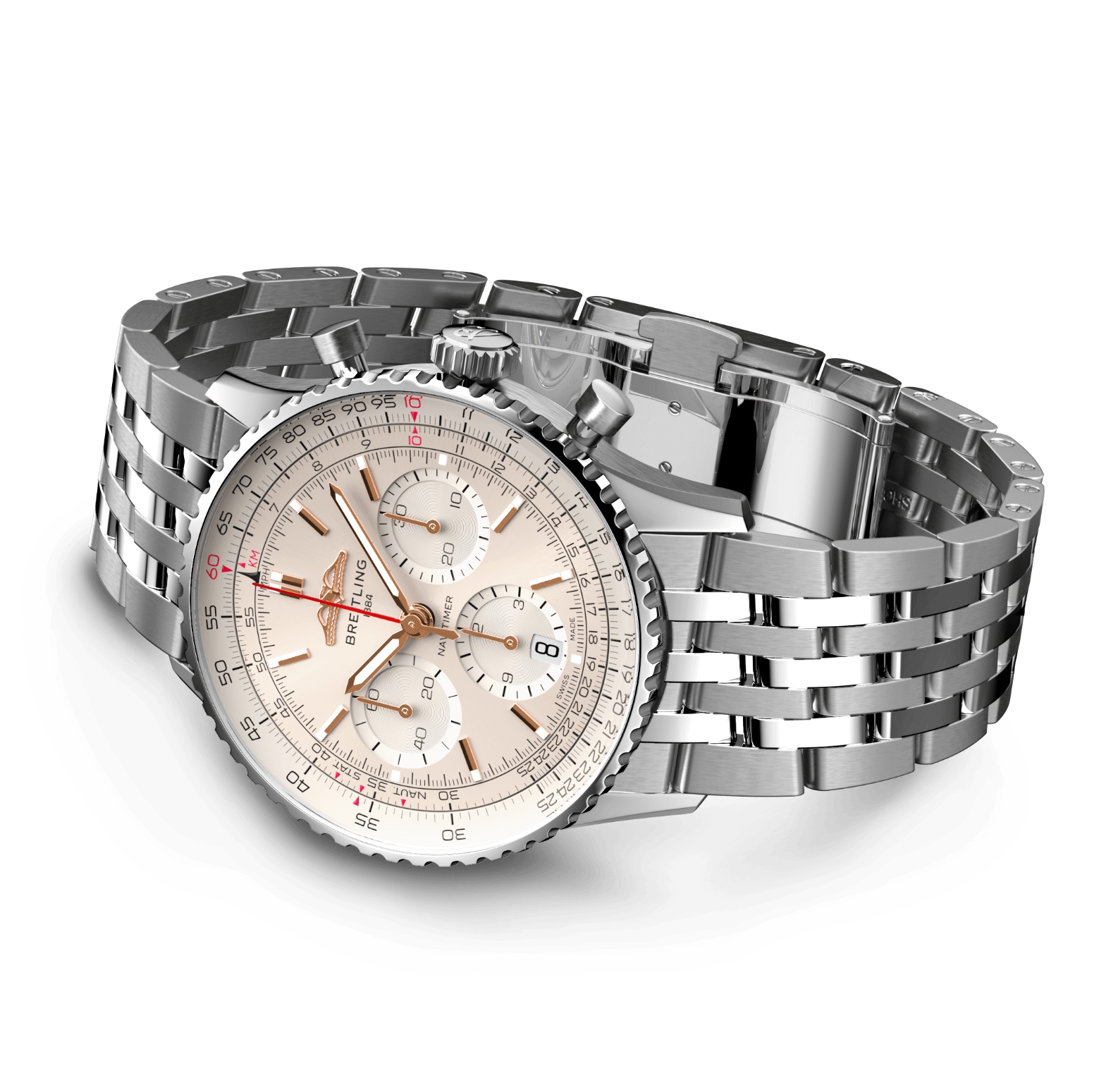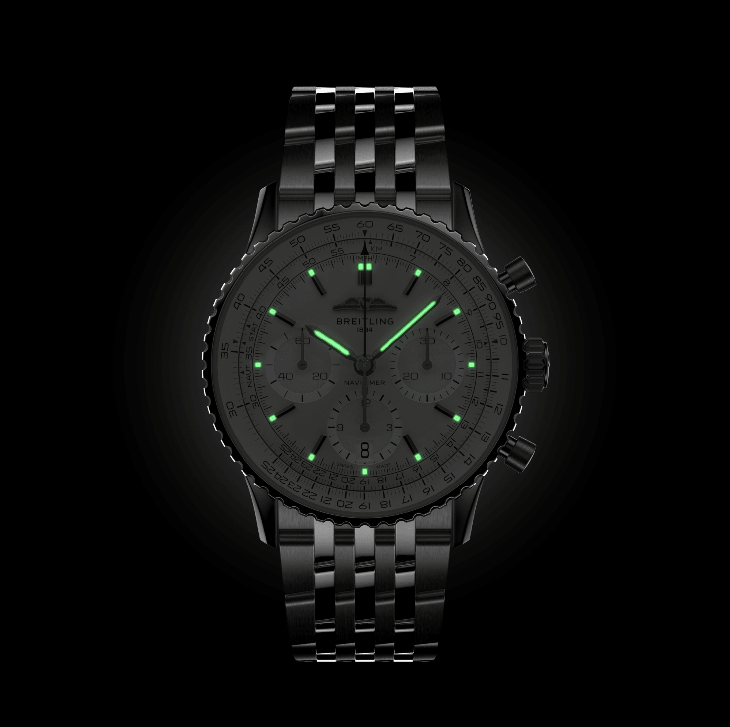 Breitling’s iconic pilot’s chronograph – for the journey. In 1952, Willy Breitling developed a wrist-worn chronograph with a circular slide rule that would allow pilots to perform all necessary flight calculations. Two years later, the Aircraft Owners and Pilots Association (AOPA) announced the design as its official timepiece. The “navigation timer” – or Navitimer – was born. The AOPA was (and remains) the largest pilots’ club in the world, counting nearly every US aviator among its ranks. As the defacto pilot’s watch throughout the glory days of civil aviation, the Navitimer was worn by airline captains and aircraft enthusiasts. It even made its way into space on the wrist of astronaut Scott Carpenter in 1962. And it wasn’t only pilots drawn to the watch’s irrepressible aesthetic. Celebrities of the day such as Miles Davis and Serge Gainsbourg were devotees, proving that the Navitimer had style as well as function. There have been many iterations of Breitling’s icon since its debut 70 years ago, but this new Navitimer captures its most classic features, while enhancing them with modern refinements. A flattened slide rule and a domed crystal create the illusion of a sleeker profile. Alternating polished and brushed metal elements give a lustrous, yet understated finish. Most notably, new colors in shades of blue, green and copper, define the updated dial options. And if there is one update sure to spark nostalgia, it’s the return of the AOPA wings to their original position at 12 o’clock. For 70 years, Breitling’s original pilot’s watch has been beloved by aviators and tastemakers in equal measure. Worn by astronauts in space and the biggest stars on earth, it is Breitling’s most iconic timepiece and one of the most recognizable watches of all time.