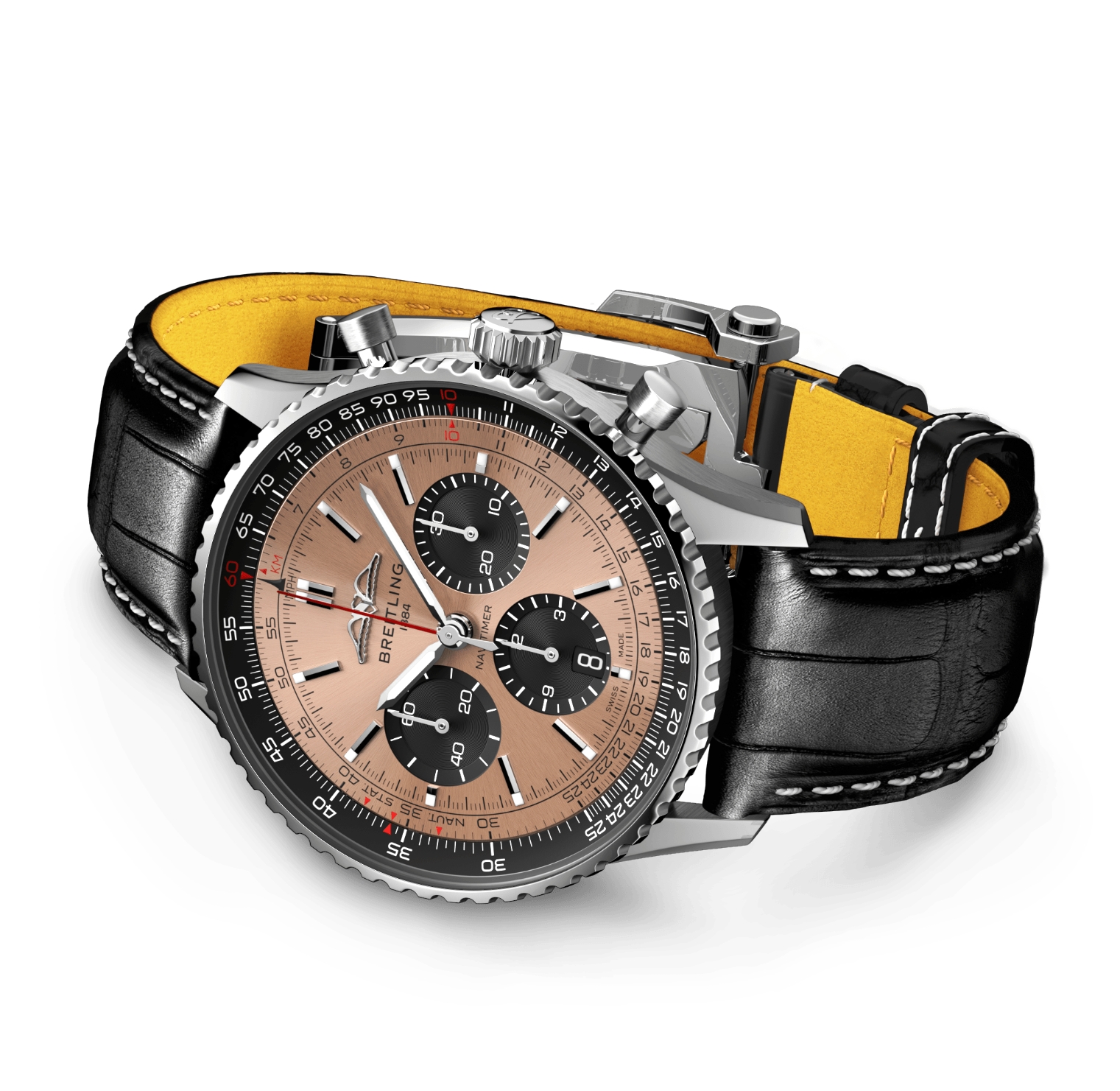 Breitling’s iconic pilot’s chronograph – for the journey. In 1952, Willy Breitling developed a wrist-worn chronograph with a circular slide rule that would allow pilots to perform all necessary flight calculations. Two years later, the Aircraft Owners and Pilots Association (AOPA) announced the design as its official timepiece. The “navigation timer” – or Navitimer – was born. The AOPA was (and remains) the largest pilots’ club in the world, counting nearly every US aviator among its ranks. As the defacto pilot’s watch throughout the glory days of civil aviation, the Navitimer was worn by airline captains and aircraft enthusiasts. It even made its way into space on the wrist of astronaut Scott Carpenter in 1962. And it wasn’t only pilots drawn to the watch’s irrepressible aesthetic. Celebrities of the day such as Miles Davis and Serge Gainsbourg were devotees, proving that the Navitimer had style as well as function. There have been many iterations of Breitling’s icon since its debut 70 years ago, but this new Navitimer captures its most classic features, while enhancing them with modern refinements. A flattened slide rule and a domed crystal create the illusion of a sleeker profile. Alternating polished and brushed metal elements give a lustrous, yet understated finish. Most notably, new colors in shades of blue, green and copper, define the updated dial options. And if there is one update sure to spark nostalgia, it’s the return of the AOPA wings to their original position at 12 o’clock. For 70 years, Breitling’s original pilot’s watch has been beloved by aviators and tastemakers in equal measure. Worn by astronauts in space and the biggest stars on earth, it is Breitling’s most iconic timepiece and one of the most recognizable watches of all time.