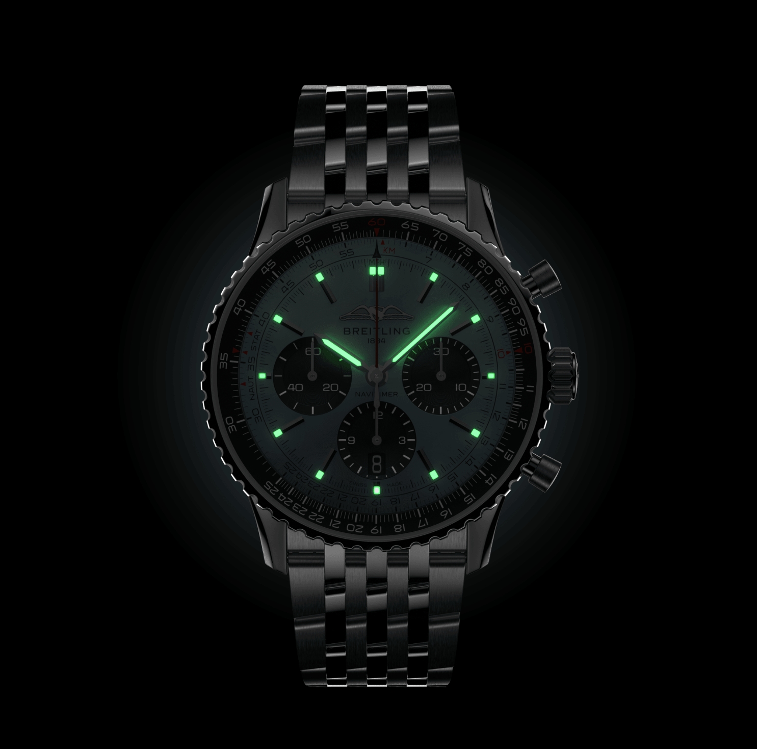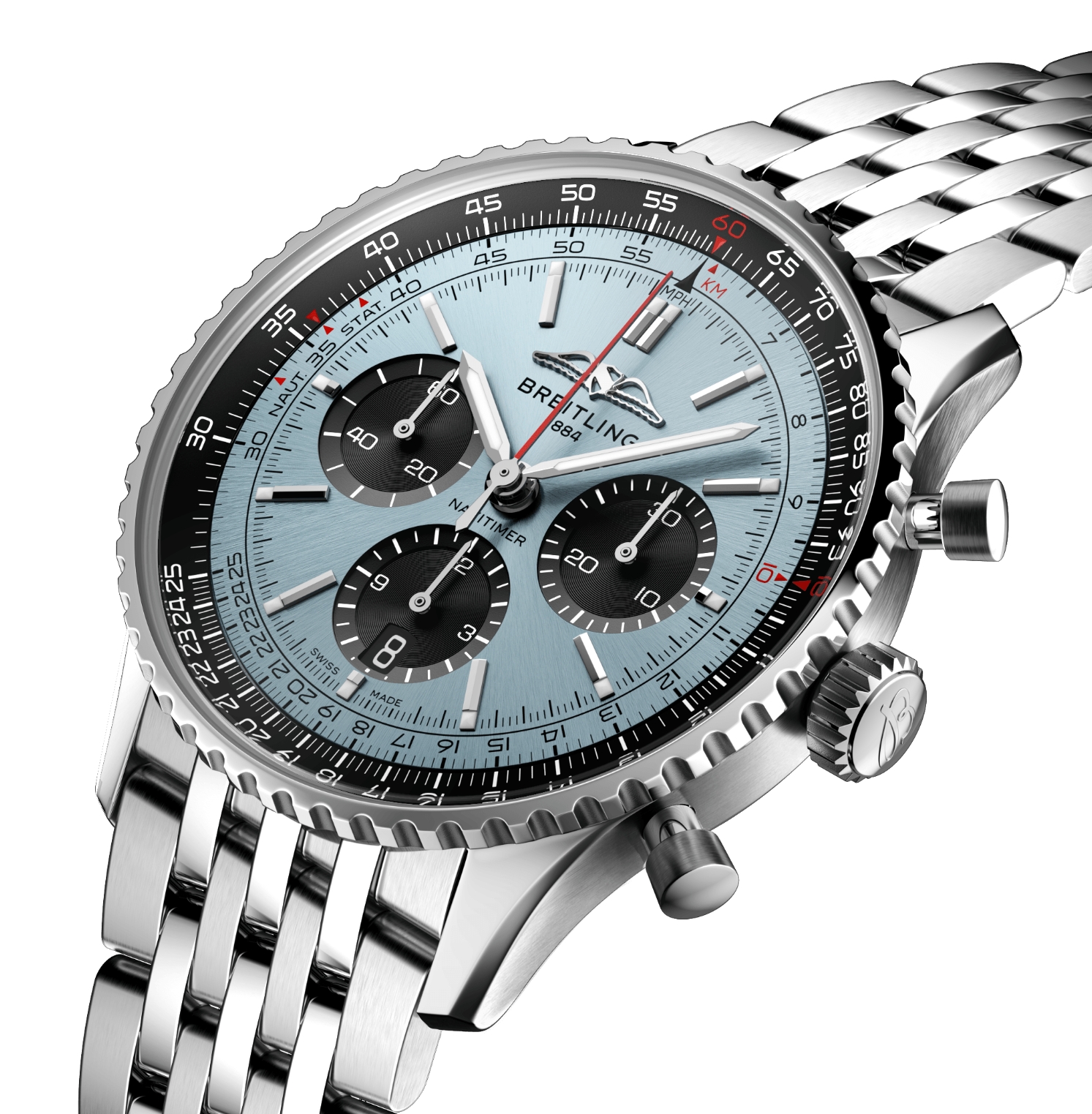 Breitling’s iconic pilot’s chronograph – for the journey. In 1952, Willy Breitling developed a wrist-worn chronograph with a circular slide rule that would allow pilots to perform all necessary flight calculations. Two years later, the Aircraft Owners and Pilots Association (AOPA) announced the design as its official timepiece. The “navigation timer” – or Navitimer – was born. The AOPA was (and remains) the largest pilots’ club in the world, counting nearly every US aviator among its ranks. As the defacto pilot’s watch throughout the glory days of civil aviation, the Navitimer was worn by airline captains and aircraft enthusiasts. It even made its way into space on the wrist of astronaut Scott Carpenter in 1962. And it wasn’t only pilots drawn to the watch’s irrepressible aesthetic. Celebrities of the day such as Miles Davis and Serge Gainsbourg were devotees, proving that the Navitimer had style as well as function. There have been many iterations of Breitling’s icon since its debut 70 years ago, but this new Navitimer captures its most classic features, while enhancing them with modern refinements. A flattened slide rule and a domed crystal create the illusion of a sleeker profile. Alternating polished and brushed metal elements give a lustrous, yet understated finish. Most notably, new colors in shades of blue, green and copper, define the updated dial options. And if there is one update sure to spark nostalgia, it’s the return of the AOPA wings to their original position at 12 o’clock. For 70 years, Breitling’s original pilot’s watch has been beloved by aviators and tastemakers in equal measure. Worn by astronauts in space and the biggest stars on earth, it is Breitling’s most iconic timepiece and one of the most recognizable watches of all time.