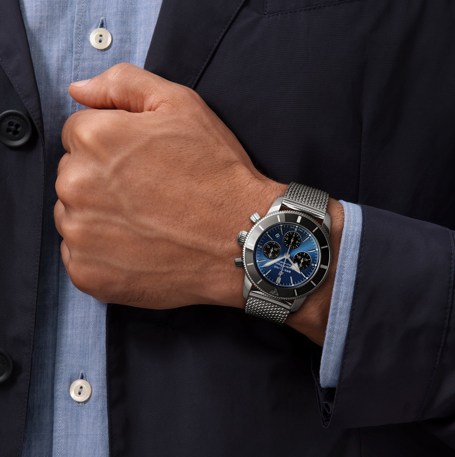 Inspired by the original Superocean from the 1950s, the Superocean Heritage combines iconic design features with a modern touch. Sporty and elegant, the Superocean Heritage is a true embodiment of style at sea. Featuring the iconic triangular-shaped hands as well as a unidirectional bezel with a polished ceramic ring, the Superocean Heritage is an elegant looking diver’s watch. Available in a variety of materials including stainless steel and 18k red gold, the Superocean Heritage B01 Chronograph 44 features a range of black, blue, silver, or green dials. Offered either with a matching mesh bracelet, or a “mesh-styled” rubber strap fitting a folding buckle, this Superocean Heritage is powered by the in-house Breitling Manufacture Caliber 01, a COSC-certified chronometer.