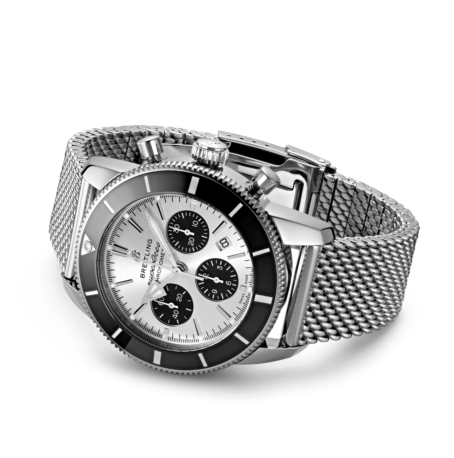 Inspired by the original Superocean from the 1950s, the Superocean Heritage combines iconic design features with a modern touch. Sporty and elegant, the Superocean Heritage is a true embodiment of style at sea. Featuring the iconic triangular-shaped hands as well as a unidirectional bezel with a polished ceramic ring, the Superocean Heritage is an elegant looking diver’s watch. Available in a variety of materials including stainless steel and 18k red gold, the Superocean Heritage B01 Chronograph 44 features a range of black, blue, silver, or green dials. Offered either with a matching mesh bracelet, or a “mesh-styled” rubber strap fitting a folding buckle, this Superocean Heritage is powered by the in-house Breitling Manufacture Caliber 01, a COSC-certified chronometer.